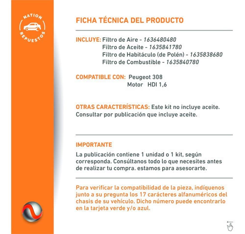 Para verificar la compatibilidad de la pieza, indíquenos junto a su pregunta los 17 caracteres alfanuméricos del chasis de su vehículo. Dicho número puede encontrarlo en la tarjeta verde y/o azul.